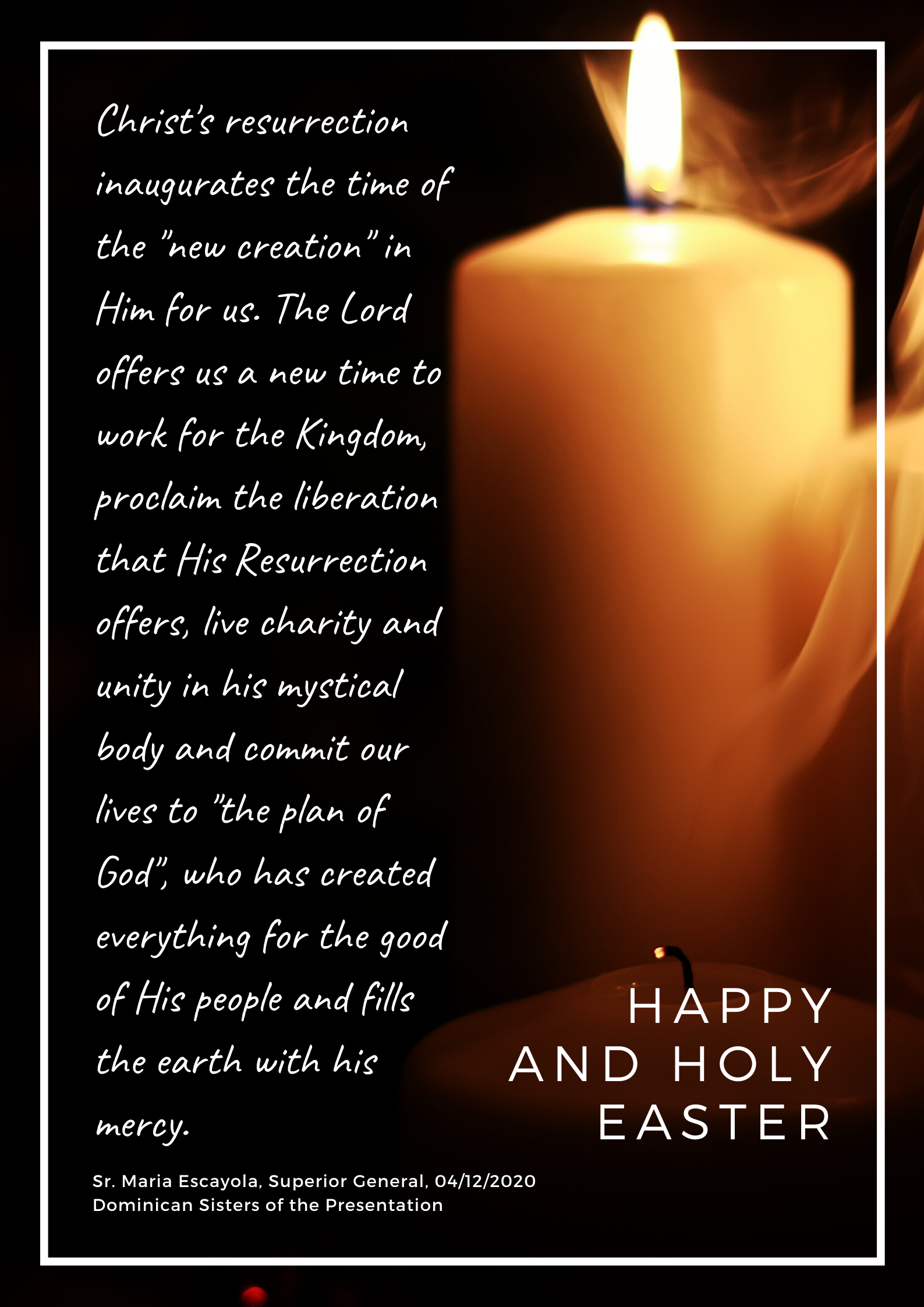 04/12/2020.- Christ's resurrection inaugurates the time of the "new creation" in Him for us. The Lord offers us a new time to work for the Kingdom, proclaim the liberation that His Resurrection offers, live charity and unity in his mystical body and commit our lives to "the plan of God", who has created everything for the good of His people and fills the earth with his mercy (Sr. Maria Escayola, Superior General).