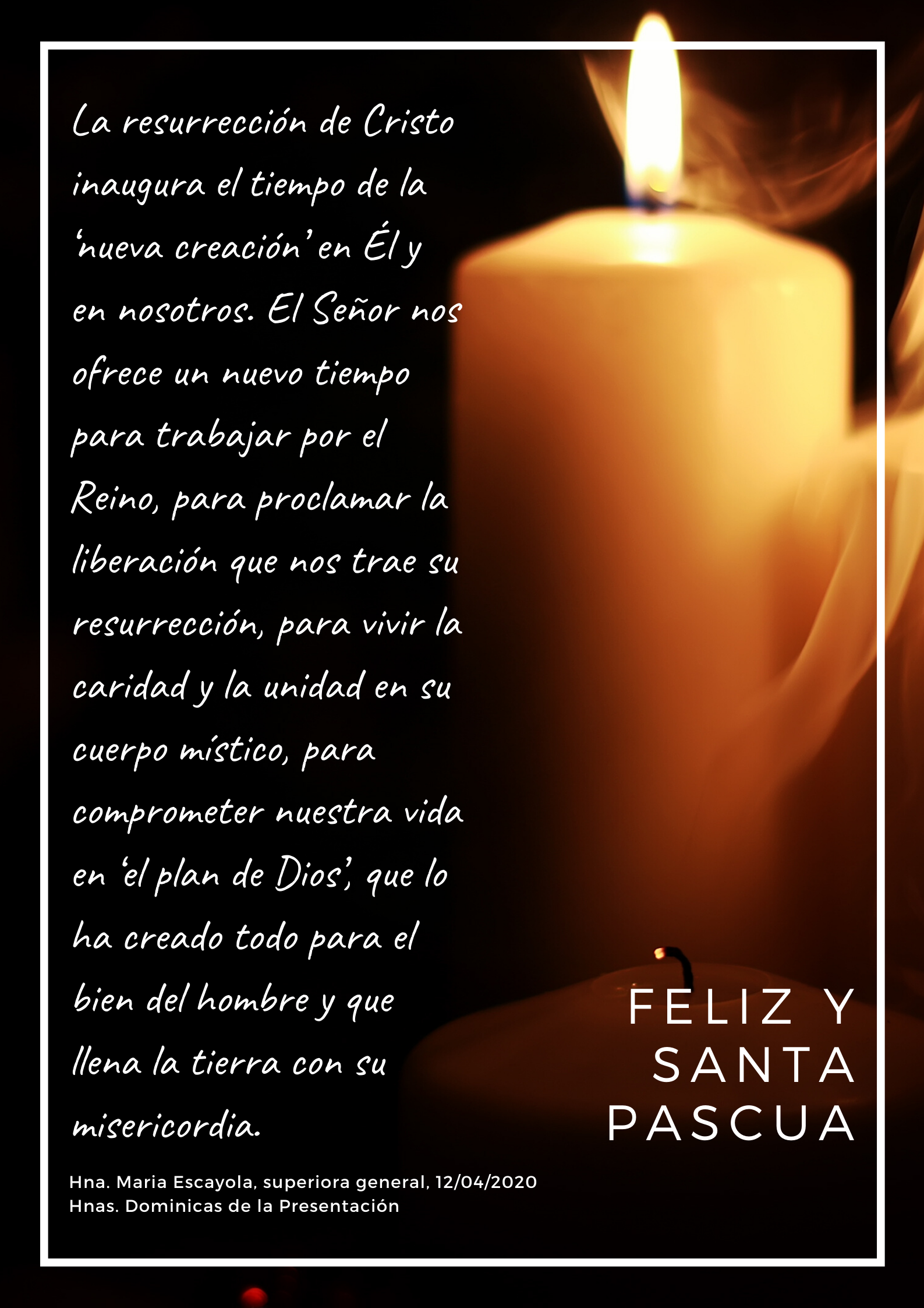 12/04/2020.- La resurrección de Cristo inaugura el tiempo de la ‘nueva creación’ en Él y en nosotros. El Señor nos ofrece un nuevo tiempo para trabajar por el Reino, para proclamar la liberación que nos trae su resurrección, para vivir la caridad y la unidad en su cuerpo místico, para comprometer nuestra vida en ‘el plan de Dios’, que lo ha creado todo para el bien del hombre y que llena la tierra con su misericordia (Hna. Maria Escayola, superiora general).