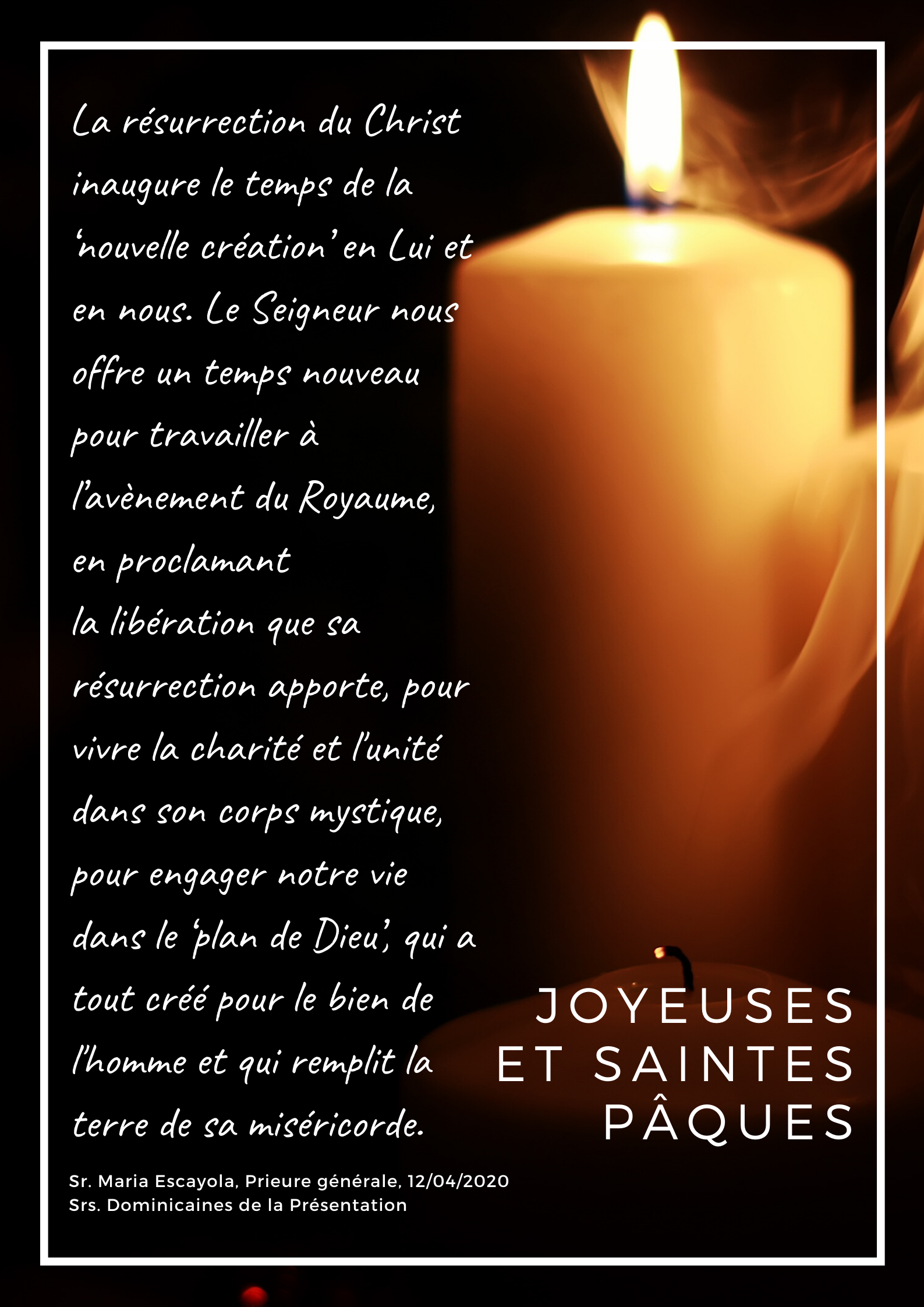 12/04/2020.- La résurrection du Christ inaugure le temps de la ‘nouvelle création’ en Lui et en nous. Le Seigneur nous offre un temps nouveau pour travailler à l’avènement du Royaume, en proclamant la libération que sa résurrection apporte, pour vivre la charité et l'unité dans son corps mystique, pour engager notre vie dans le ‘plan de Dieu’, qui a tout créé pour le bien de l'homme et qui remplit la terre de sa miséricorde (Sr. Maria Escayola, Prieure générale).